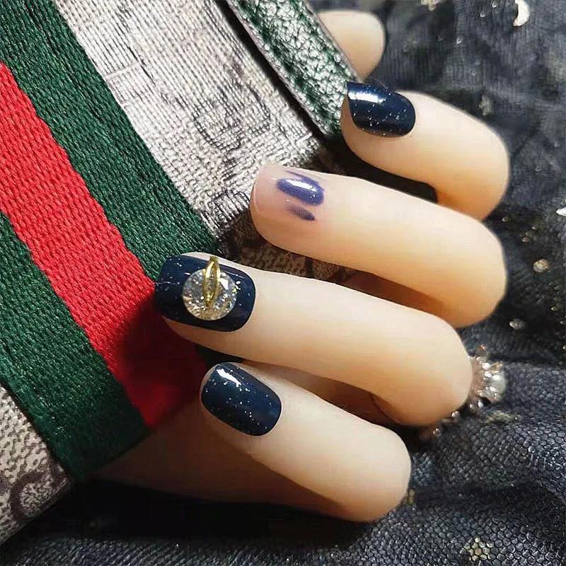 24pcs Set Navy Blue Rhinestone Decor Faux Nails Finished Short