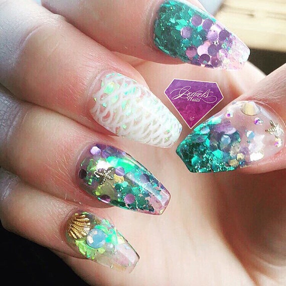 Sea Theme Nails Mermaid Nails Glitter Uv Gel Nails Gel Nails Reusable Swarovski Bling Press Ons Press On Nails