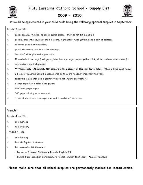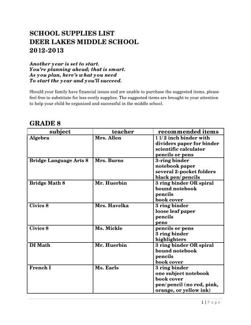 School Supplies List Deer Lakes Middle School 2012 2013 Grade 8